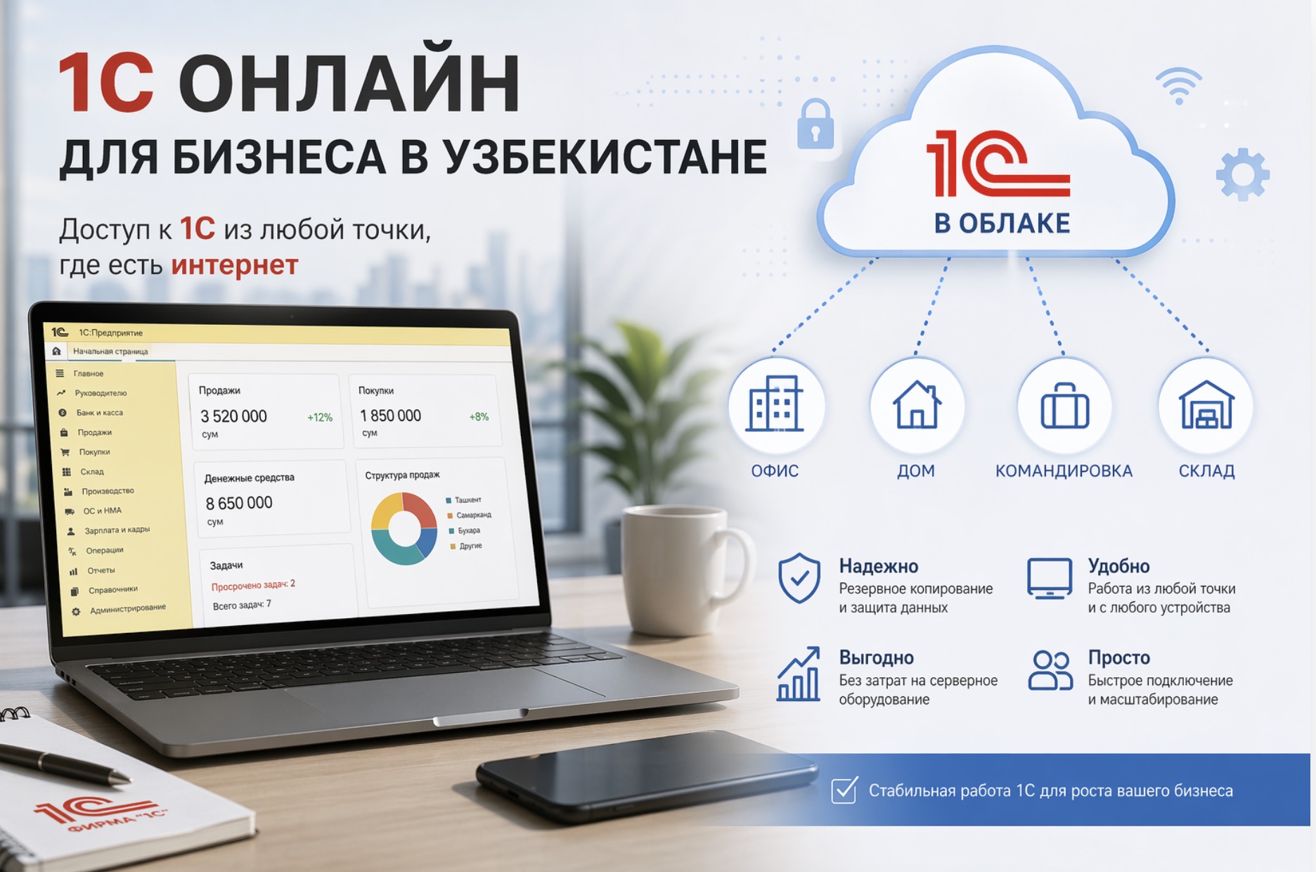 1С онлайн — это формат работы с учетной системой через интернет, без локального сервера в офисе и без привязки к одному рабочему компьютеру.