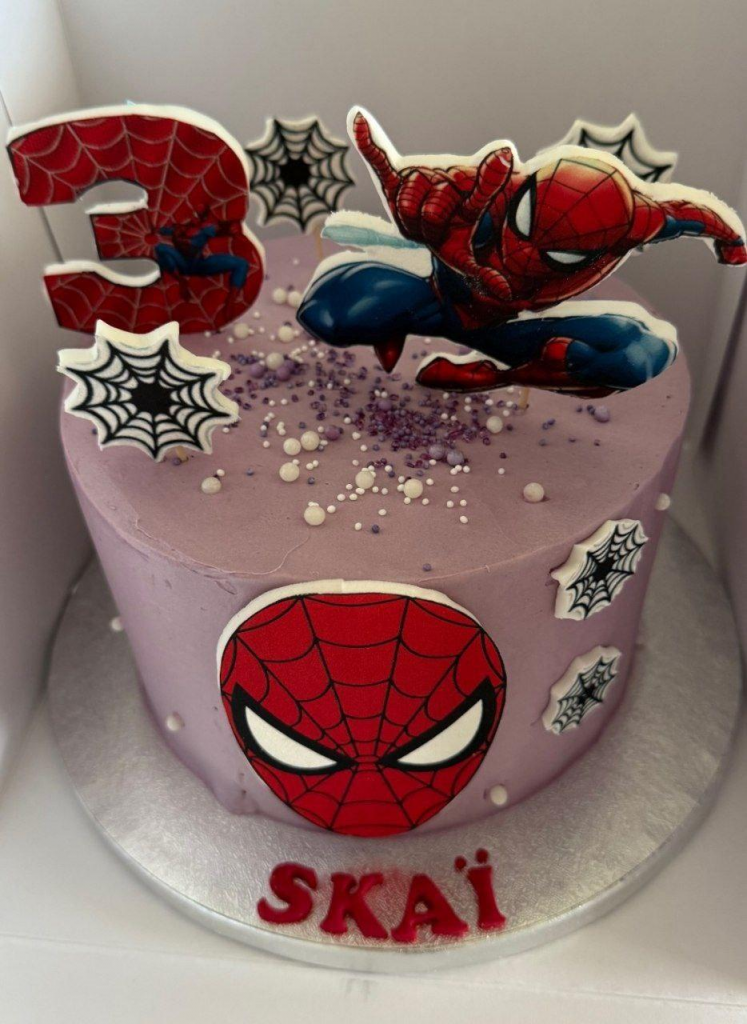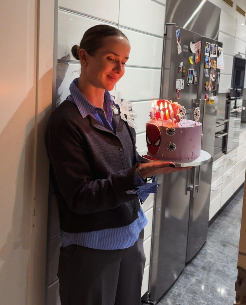 В Instagram Элина поделилась серией снимков со дня праздника. На фото можно увидеть яркий торт в фиолетовых тонах, украшенный элементами из вселенной Человека-паука. На верхушке десерта — фигурка супергероя в красно-синем костюме, рядом большая цифра «3» и декоративные маски с паутиной. Внизу красными буквами выложено имя именинницы — SKAÏ.