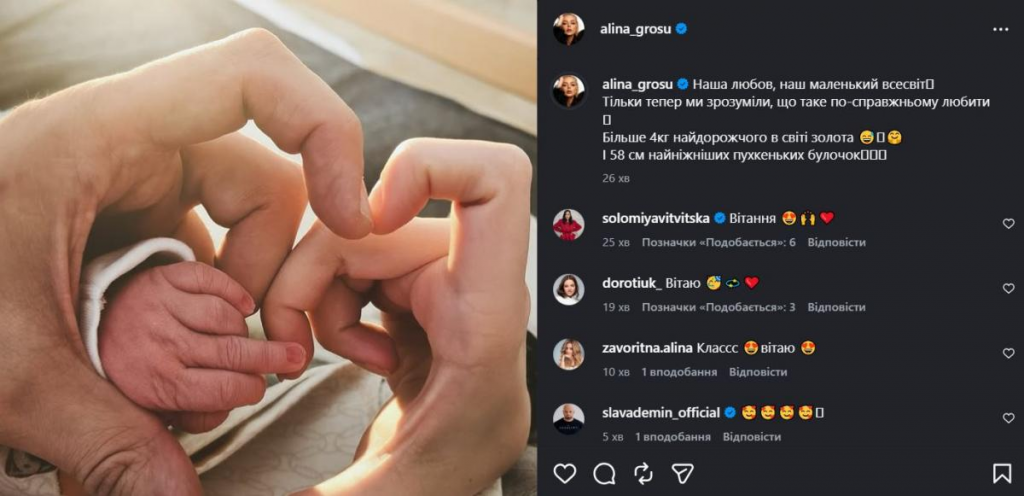 Известная украинская певица Алина Гросу впервые стала мамой. Артистка сообщила о рождении ребенка в своих социальных сетях и опубликовала первые кадры с новорожденным сыном. Об этом сообщает Glavpost со ссылкой на Instagram.