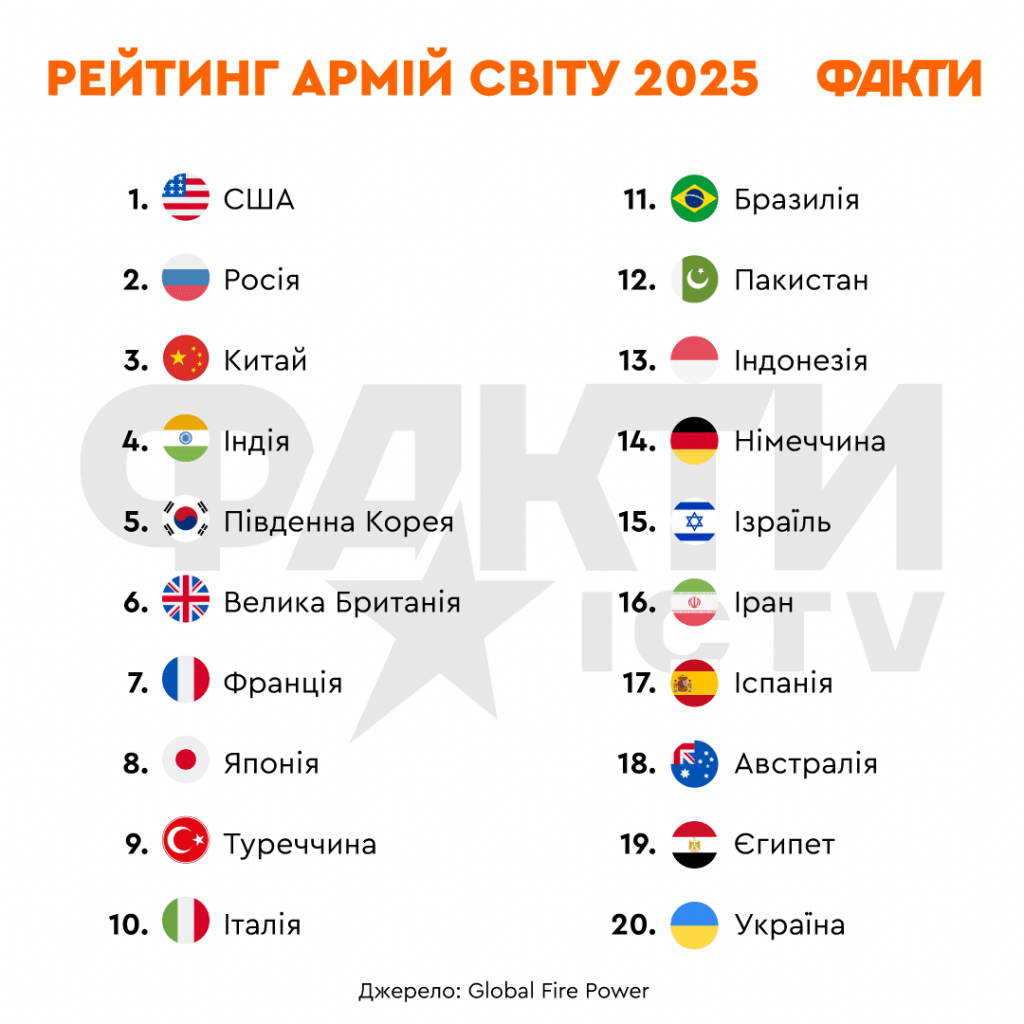 Global Fire Power опубликовал рейтинг армий мира 2025 года, где Украина занимает 20-е место, понизив свою позицию по сравнению с 2024 годом.