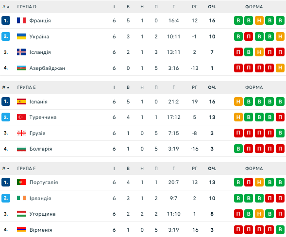 Сборная Украины попала в группу D, где заняла второе место, уступив только Франции, но опередив Исландию и Азербайджан. Это позволило Украине выйти в плей-офф, где она уже ожидает своих потенциальных соперников.